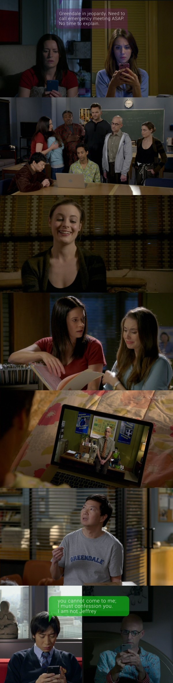 "Basic Crisis Room Decorum wouldn’t be a great episode of old Community, but it’s a great episode of this version of the show, one that succeeds as many of the show’s best episodes do, by cramming everyone into the study room and letting them bounce off each other. "Decorum" doesn’t match the quality of "Cooperative Calligraphy" or "Cooperative Polygraphy," but it echoes those episodes with all of the characters-even Vicki!-confined to the study room to solve a problem. (AVClub) Ich denke, das war auch so eine der guten Folgen und Paget Brewster ist nicht nur unglaublich Milfig die hat sich auch so dermaßen gut in die Serie eingefügt, als ob sie immer dabei war. Der Blick von ihr, als als Annie Chang fragt, woher er von dem Treffen weiß, war sehr verdächtig. Läuft das was zwischen Frankie und Chang? Bitte, bitte, lass da was laufen! Britta gefällt mir betrunken nicht. Anonsten ![]() ![]() |