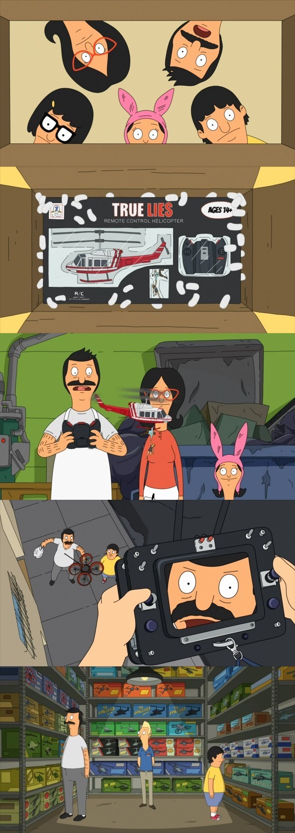What the hell is that? I bought a remote control version of the helicopter from the movie True Lies, complete with a clutching Arnold Schwarzenegger and dangling Jamie Lee Curtis. Were you drunk shopping? No. I call it "nighttime shopping, with wine. Wie bitte? Auf so eine Idee muss man erst mal kommen. Hallo? Und die ganze RC-Helicopter-Warfare-Sache war so viel besser als das müllige Drohnen-Thema bei South Park. ![]() |
