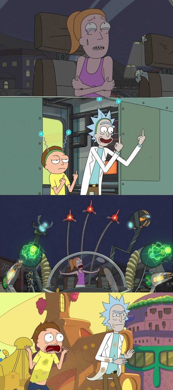 I thought we were inside your car battery, Rick. T-t-this is like a whole p-planet or something. Thanks, Morty. I'm pretty proud of this bad boy. Check it out. I put a spatially tessellated void inside a modified temporal field until a planet developed intelligent life. I then introduced that life to the wonders of electricity, which they now generate on a global scale. And, you know, some of it goes to power my engine and charge my phone and stuff. You have a whole planet sitting around making your power for you? :-O Pure madness. Vielleicht sind wir auch nur ein Planet in einer Batterie. Arme Summer. ![]() |
