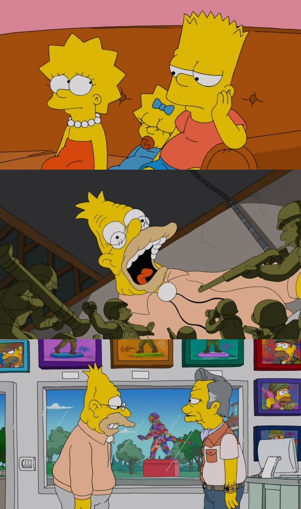 "Motivated by a PTSD episode Grampa had while babysitting the kids, the Simpsons take a journey to Grampa's past as a post-WW2 toy model for plastic army men, and Abe finally faces his on confused sexuality." (IMDB) ![]() |