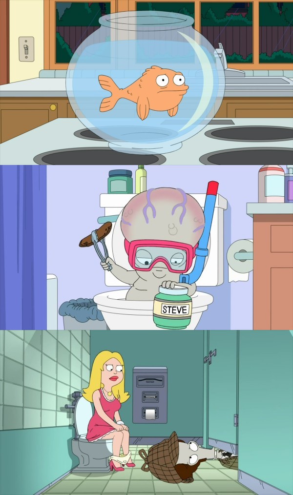 "As Francine slips out of the house, supposedly to go to the library, the family speculates on her actual whereabouts. But when Stan's tracker reveals she is actually at the library, he is determined to stop her from reading and being a 'nerd', so he follows her to the library. Meanwhile, Rogu's 'fishing' for the family's bowel movements reveals that Francine doesn't use the toilet in the house, so Roger decides to investigate it as a mystery as 'Sherlock Groans'." ![]() |