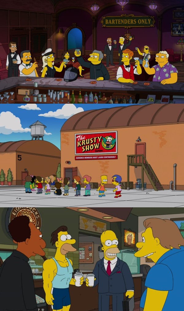 Die Hidden Society der Barkeeper in der Moe natürlich Mitglied ist, fand ich gelungen. Denn Barkeeper trinken niemals in der eigenen Bar sondern woanders und dürfen dort auch ihr Leid klagen. Mo hat den Fehler gemacht, in der eigenen Bar zu trinken und dann zu singen wie ein Vögelchen. Die Mitglieder machen danach Jagd auf Moes Gäste und spritzen ihnen eine Anti-Booze Spritze - nie wieder Allehol. ![]() |