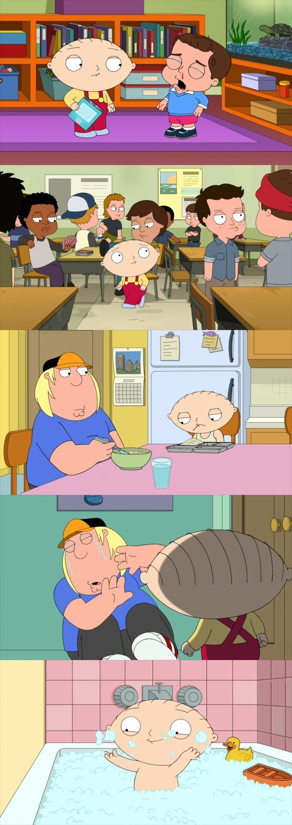 You don't know what detention was like, Brian. I feel like I aged four years in there. On the first day, an older boy put two fingers on my nose and just took it right off my face and held it in front of me and said, "I got it. I got your nose." That ever happen to you, Brian? You ever seen your own nose wiggling between two fingers right in front of your face? And he never gave it back. Stewie, what's going on in here? Okay, you are coming with me. They've got my nose, Brian. They've got my nose. They've got my... Scheint ja keine Stewie/Brian-Geschichten mehr zu geben, aber Doug ist mehr als ein guter Ersatz. ![]() |