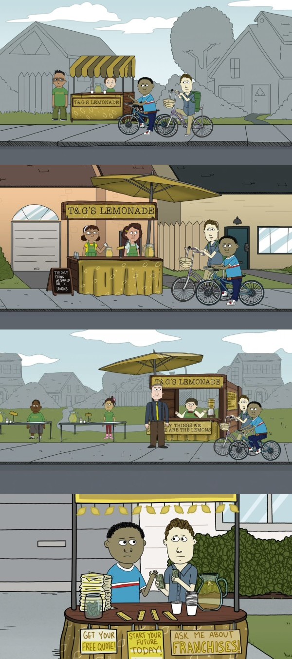Der Limonaden-Stand ist auch ein US-Trope, oder hat irgendjemand bei uns in der Kindheit/Jugend sowas gemacht? Oder kennt jemanden, der das gemacht hat oder hat mal einen hier gesehen. Schöne Folge, wobei man das durchaus noch etwas spannender mit den ganzen verschiedenen Konzepten und der Agentur hätte machen können. Nach den 100 Dollarn vom Prinzipal kam das mit der Franchise-Kette viel zu schnell. Da fehlte mir eine schöne Montage mit einem geilen Song. Nachtrag: Vielleicht Lemon-Tree?! ![]() ![]() |