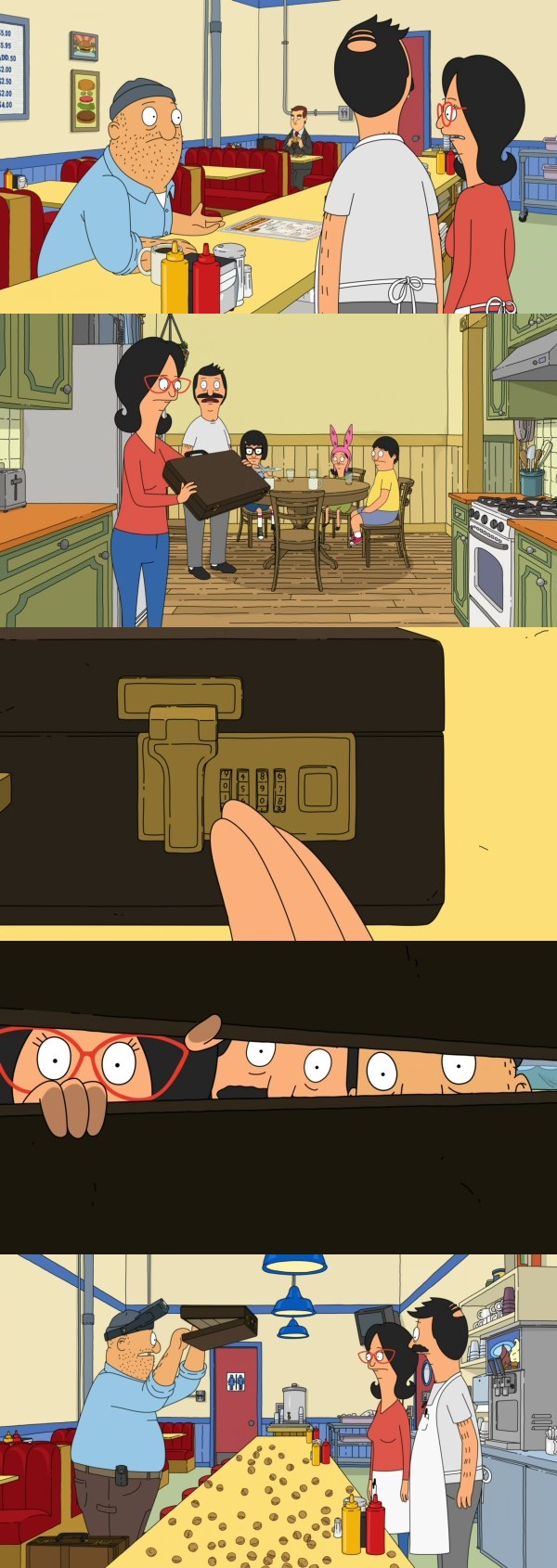 There's got to be something else in there. Nope. Just one more walnut. Huh. So it isn't a plutonium thing or a hand killer thing. Just a man who really enjoys his nuts. Wäre natürlich Gag'ig gewesen, wenn wir - wie in vielen anderen Serien oder Filmen nie erfahren hätten, was im Koffer ist. Aber wäre das so gekommen, hätte ich das wahrscheinlich auch blöd gefunden. Und: Ich habe noch nie, nie, nie einen Aktenkoffer mit 4-Stelligen Schloss gesehen. ![]() |