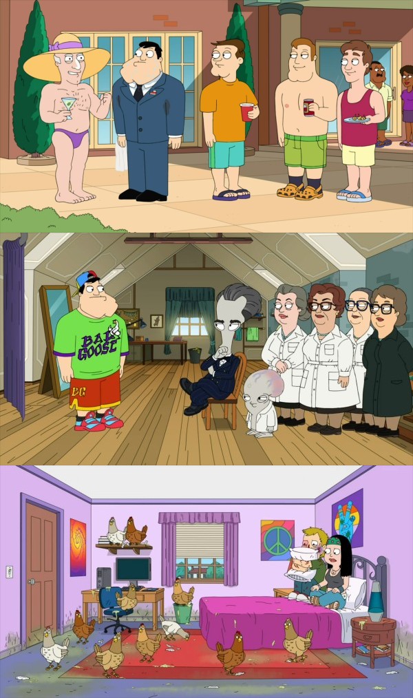 "Stan reveals to the family that he's never felt comfortable in casual clothes and that he only feels confident in suits. To help Stan, Roger revitalizes an old fashion designer persona and creates custom clothes tailored specifically for Stan. Stan finds joy and confidence in his new look, but Roger becomes jealous of all the attention. Meanwhile Hayley and Jeff raise chickens in the backyard." ![]() |