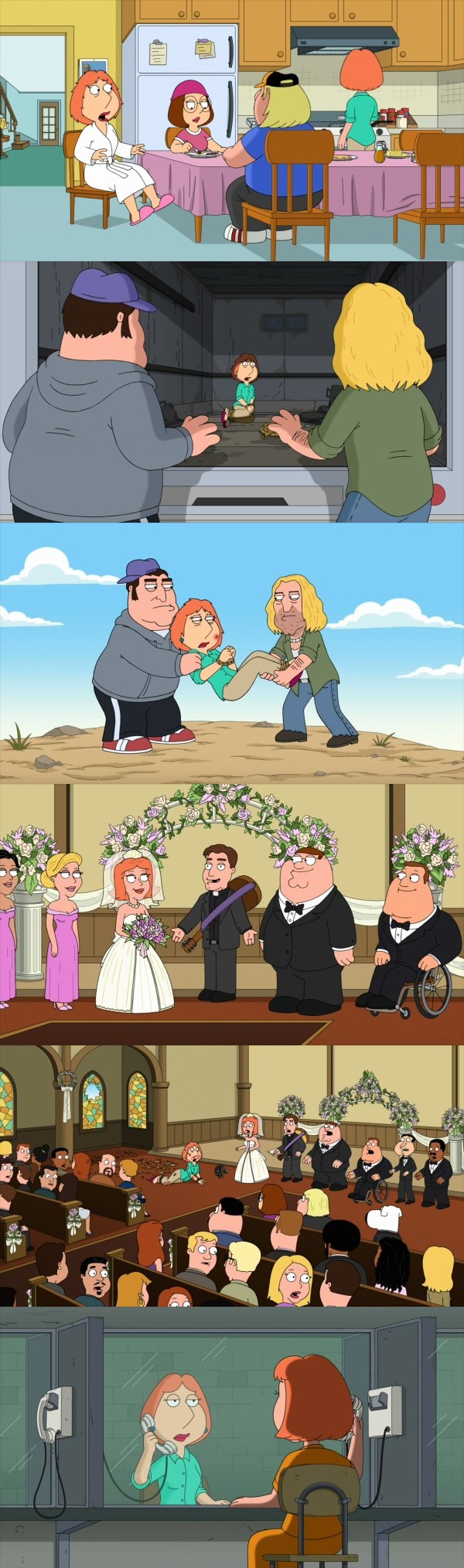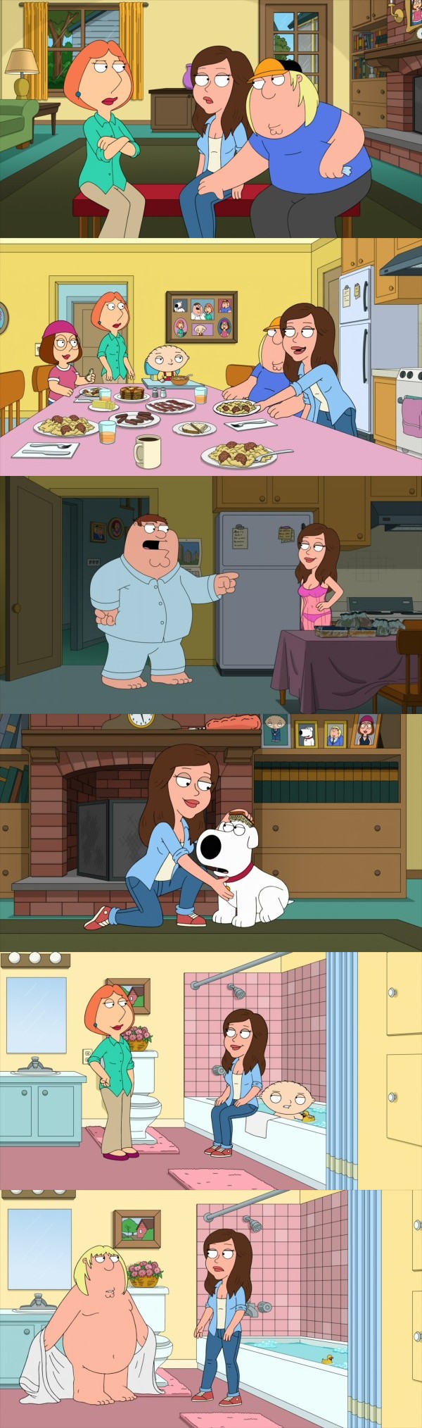 "The show opens on Alana's wedding as Stewie provides a flashback. After a piano lesson, Alana reveals that she may not be able to get into college due to money issues, so Lois talks Peter into hiring her as a housekeeper. Things go great, and the family quickly warms up to her. but when getting a late night snack, Peter runs into her in her nightgown where she flirts with him." Die Art des Rückblicks und den Off-Kommentaren haben mir nicht gefallen, ansonsten gute Folge. ![]() ![]() |