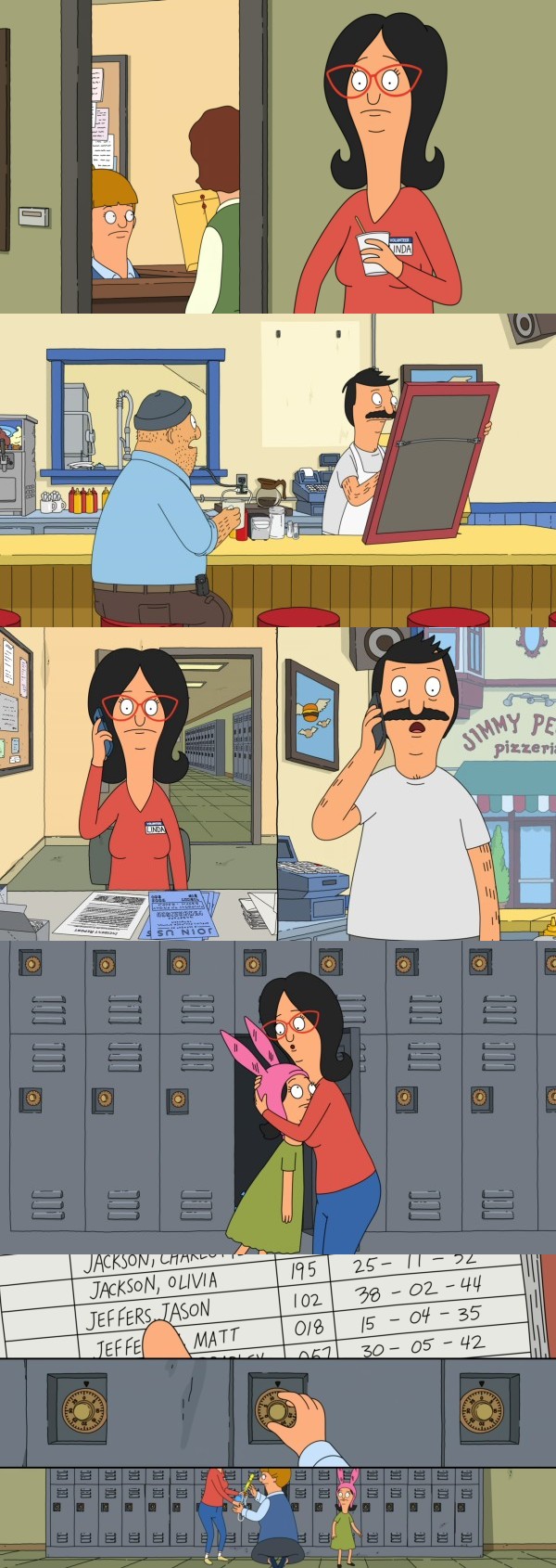 In der dreizehnten Folge der dreizehnten Staffel sehen wir das allererste Mal, wie Bob die Burger des Tages-Tafel neu schreibt. Sehr geile Krimi- Folge heute. Und wir haben mal wieder Mort und Rudy gesehen. Pocket Sized Rudy? Nein, Regular Sized Rudy! But when I'm back this afternoon, I'll skillfully question Louise, she'll confess, and then we can move on with our lives. What if she doesn't confess? She will 'cause she did it. And if she doesn't, she still did it. 'Cause I can't file away this incident report until I have a name. ![]() |