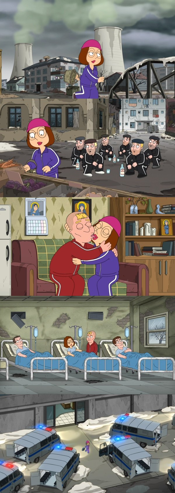 Wenn man schon Putin aber nicht den Krieg einbringt, hätte man auch ein schönes symbolisches Ende für Ivan einbauen können -- Einberufung zur 3 Tage Spezial-Operation. Meg schwört für immer auf ihn zu warten, Cut, Blick von oben auf Ivan im Graben, ein Drohnenblick. Eine Granate ploppt ins Bild. Ivan versteht nicht. Die Granate fällt, Cut zu Meg wie sie wartet. Schwarzbild. ![]() |