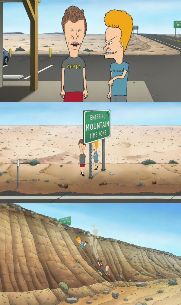 We're just a few hundred feet away from the New Mexico border, which is in the Mountain Time Zone. So if you go up the road just a bit, it's an hour earlier. Whoa. So we can, like, travel through time? Well, no. That's not how it works. It's just a different time zone. Whoa. Did you hear that, Beavis? He said we can travel to future time zones. Cool, yeah, yeah. Let's go. Bin immer wieder erstaunt, wie man auf solche Sachen kommt. Mir gefällt's. ![]() |