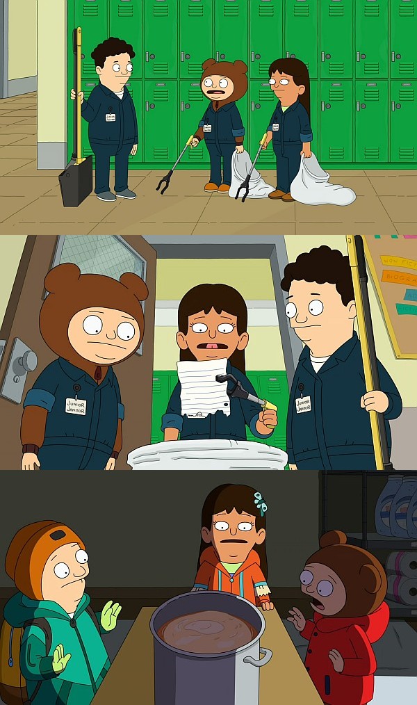 I saw Mr. Golovkin take a giant metal pot from school after-hours so no one would see him. I'm thinking we should do some extra Junior Janitoring this week to figure out what's going on. You think he's cooking something weird? Like something illegal? Like drugs? Or alcohol? Well, he did say he was cooking someone, but then he said he was cooking for someone, so... Oh, my God! He must have murdered someone and now he's making them into soup! Gar nicht mal so unlustig mit dem Junior Janitors. Da kam mir die Idee, dass eine Serie mit drei Teenagern die praktisch Erwachsenenaufgaben übernehmen und auch so behandelt werden, mir gut gefallen würde. So wie die Junior Detectives bei South Park. ![]() |