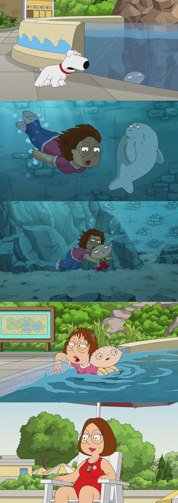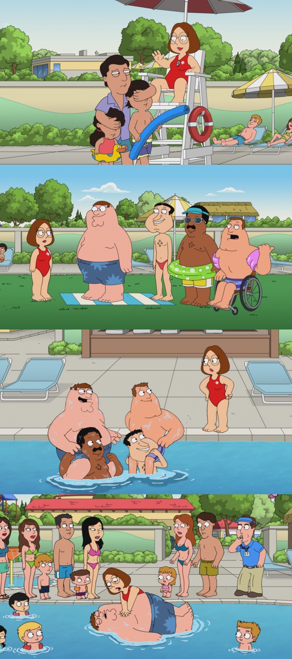 Es gab mal eine Schwimmstunden-Folge mit Stewie, die waren aber nicht Erfolgreich. Und wahrscheinlich eine sehr Amerikanische Sicht auf die Tatsache, dass Meg ihrem Vater Mund zu Mund-Beatmung gegeben hat und das irgendwie "komisch" sei. ![]() ![]() |