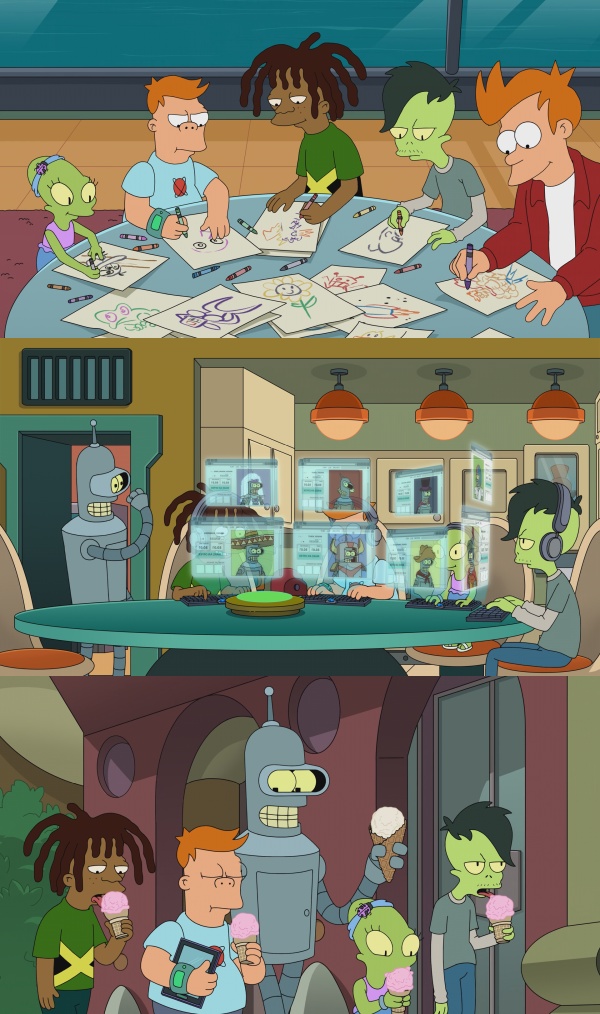Ach ja, da war ja was, die Blagen sind auch noch da. Hihi, ein NFT-Joke. MEGA! Der wird richtig, richtig gemolken der Gag. Hab jetzt schon die Schnauze voll. Anscheinend eine ganze NFT-Folge. So halb -- danach geht Bender nach Mexico auf der Suche nach seiner selbst. Keine Lust mehr. ![]() |