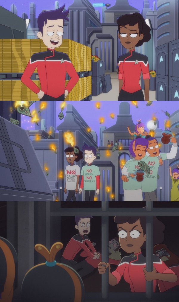 Schon wieder Tendi und die Orionaer-Gang. Gähn. "The Cerritos has arrived at Targalus IX, a recent addition to the... ...Federation, to held dismantle their capitalist system of wealth... ...having just acquired post-scarcity technology, the Targalans are... ...removing their obsolete financial structures to make room for... ...museums and meditation gardens." Gleichzeitig sieht man die Targalaner Geld verbrennen und Replikatoren... ...bedienen. Ich habe mir darüber noch nie Gedanken gemacht und ob das... ...jemals schon Thema in den Star Trek-Serien war? Kurioserweise nimmt die Föderation alles Wertvolle über... "Recycling Center" mit nach Hause. Höhö. Tendis Schwester ist Schwanger. Wahnsinn. Ed bilden sich zahlreise Terror-Gruppen, die damit nicht einverstanden sind. "They strapped weapons to their household robots, see?... ...that one's trying to sweep up with a disruptor". Lölchen! Oh, zwei tote Crewmitglieder. War nur ein Trick. Tendi wieder auf der Cerritos. Irgendwas läuft hier mit der Serie schief. ![]() |