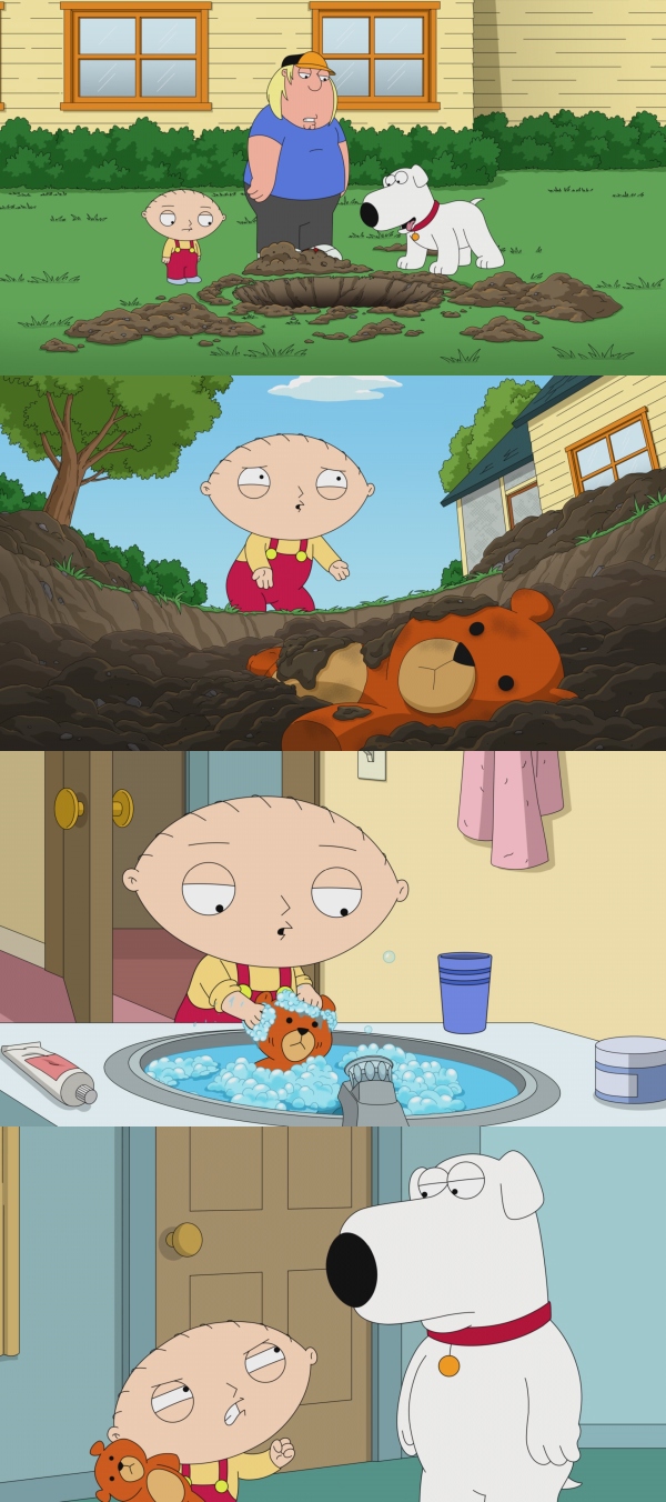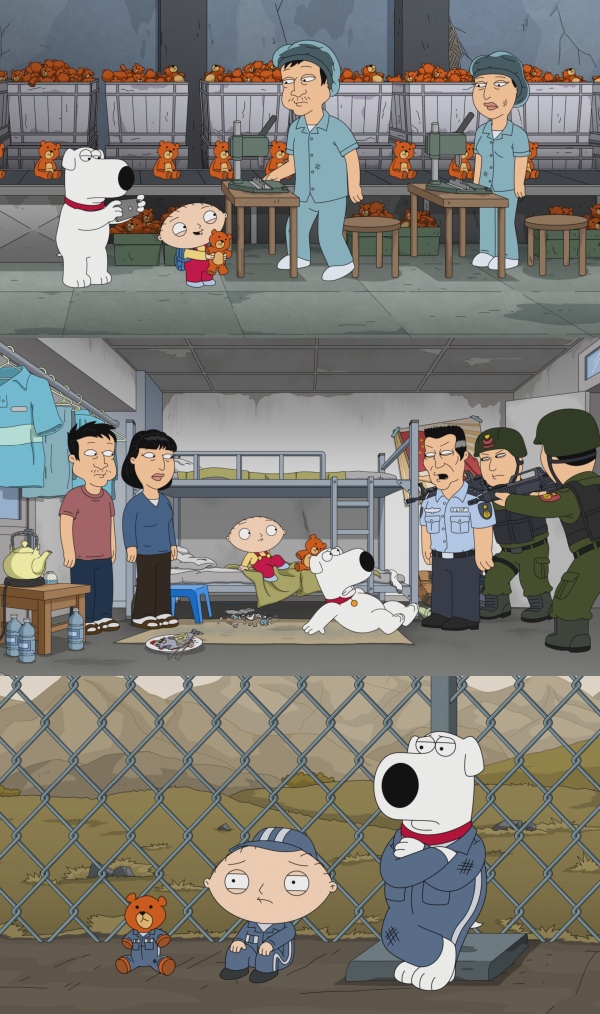 What is this?! "Made in China" Rupert, you're Chinese?! Lölchen, ich mag's ja total, wenn Stewie so Stewie ist. Die Family Guy Macher sind ja seit einigen Jahren bemüht, nicht mehr in alte Verhaltens- muster zu fallen, aber das scheint nur die Heimatfront zu betreffen. Das man China heute noch wie vor 50 Jahren darstellt, finde ich es etwas schade. ![]() ![]() |